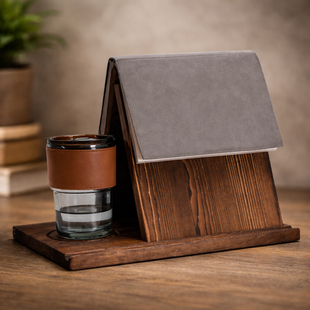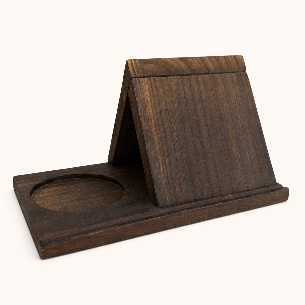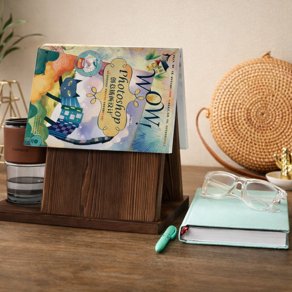 Bokhållaren är designad för att hålla din bok öppen och synlig, men det finns gott om plats för glasögon, telefon, en kopp kaffe eller andra småsaker du använder dagligen. Din lilla personliga organizer för nattduksbordet eller skrivbordet.